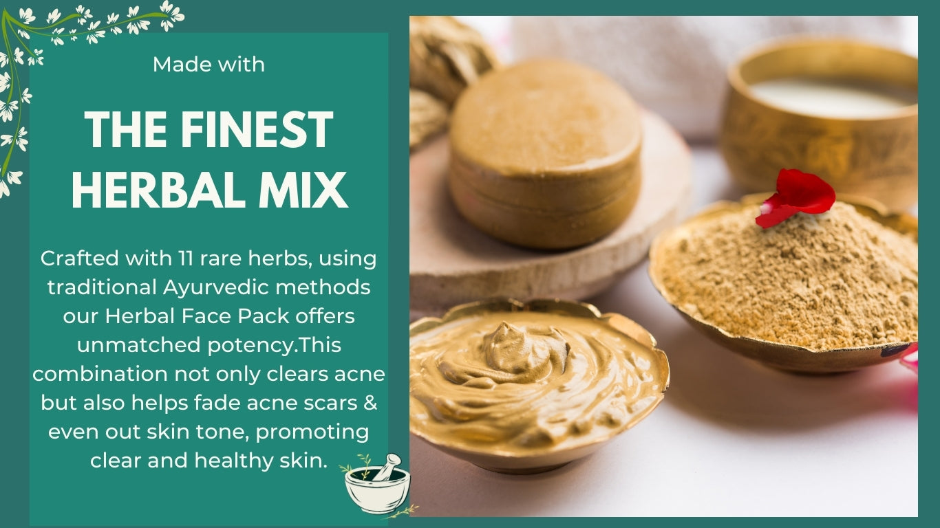 Our face mask contains a blend of potent Ayurvedic herbs like Neem, Turmeric, Lodhra, and Multani Mitti (Fuller's Earth), known for their anti-inflammatory and antibacterial properties.