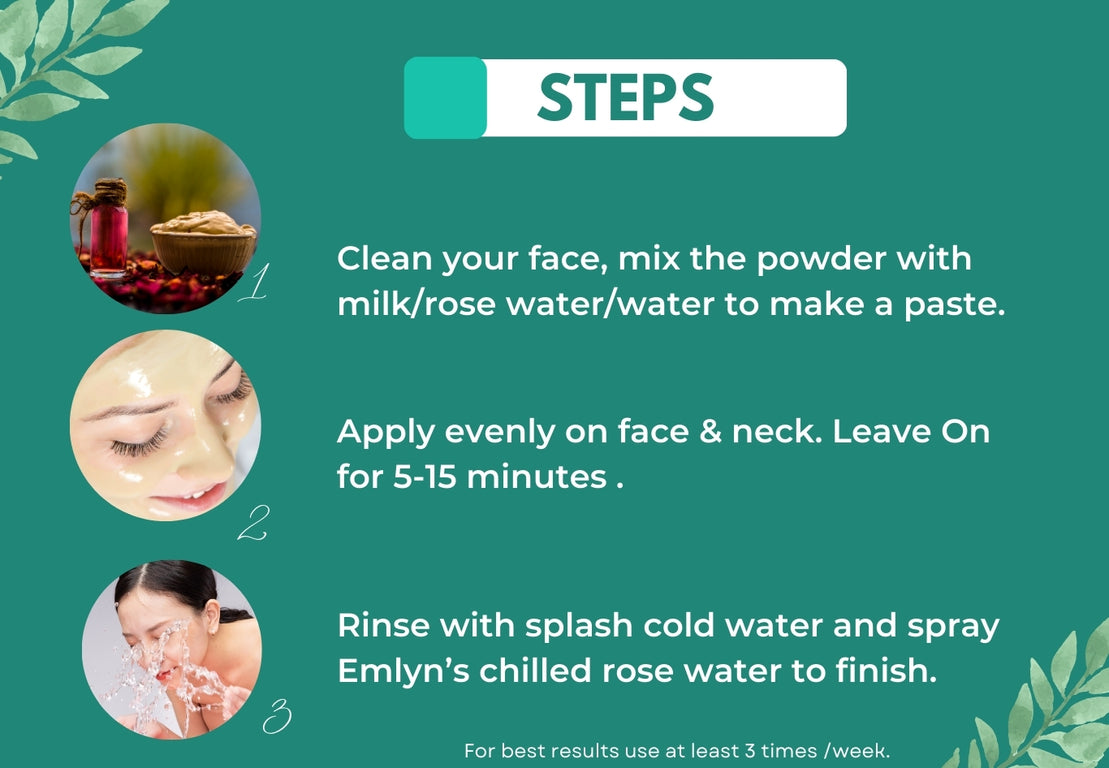 Mix a small amount of the powdered face mask with water, rose water, or yogurt to form a paste. Apply evenly to cleansed skin, leave for 15-20 minutes, then rinse off with lukewarm water.